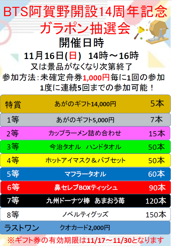| BTS阿賀野開設14周年記念ガラポン抽選会のお知らせ | |