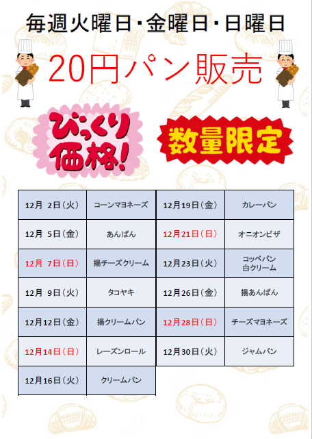 | 20円パン12月の販売日です | |