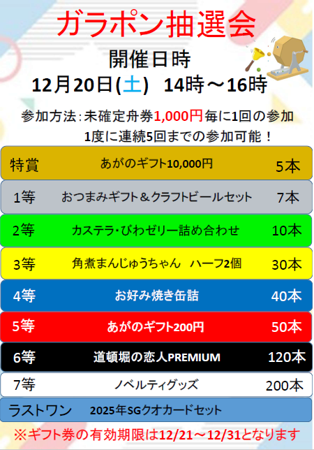 | 16:00❣から 未確定舟券500円分で1回抽選できます。 (さらに…) | |