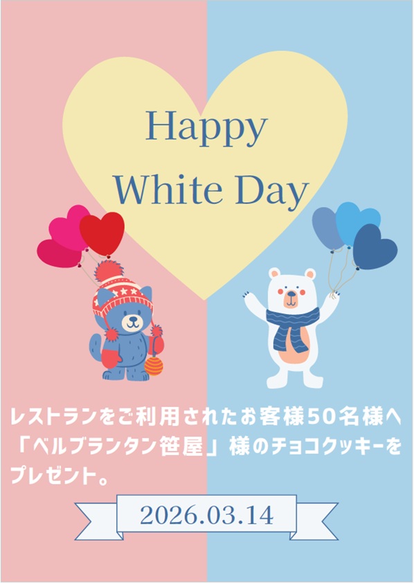 | 3/1(日)~3/8(日)の間、レストランのお会計300円毎にレストラン宝くじを配布いたします。 (さらに…) | |