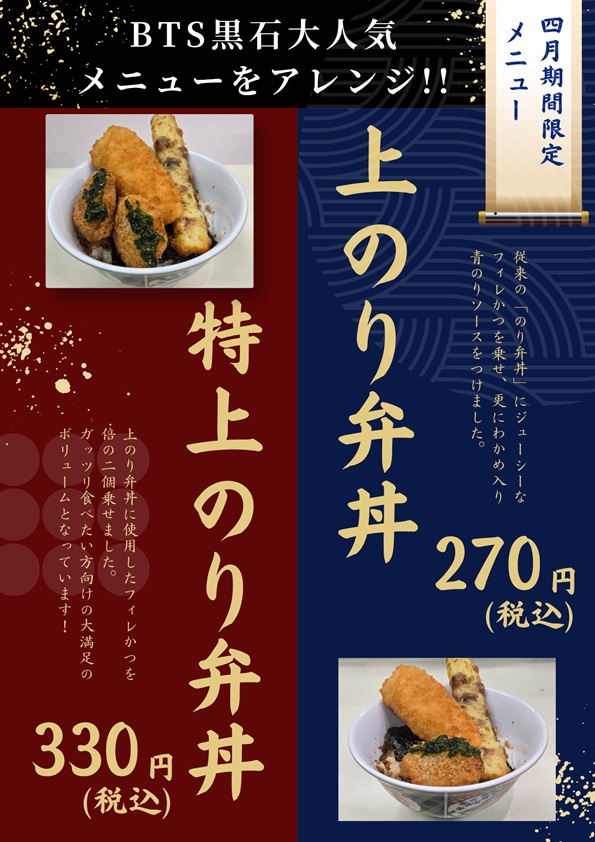 | 4/1~4/30 期間限定メニュー「上のり弁丼」「特上のり弁丼」を販売します (さらに…) | |