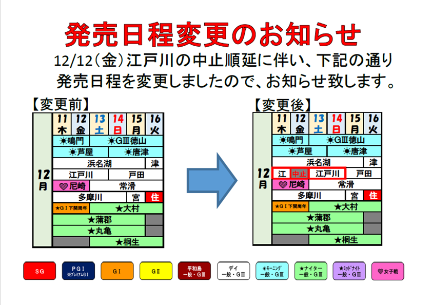 )江戸川の中止順延に伴い発売日程を変更しましたのでお知らせします。