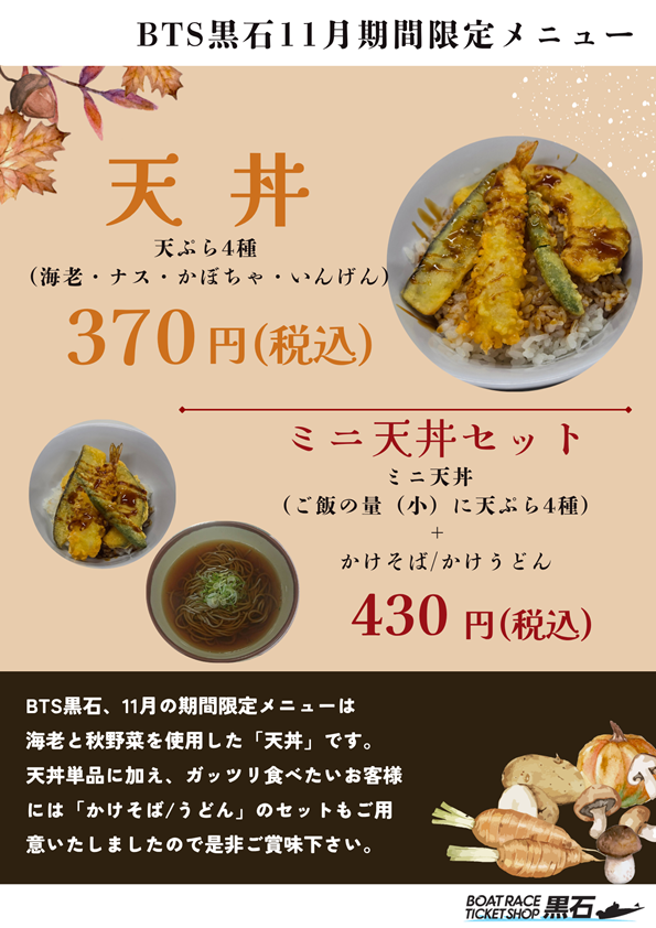 | 11/1~11/30 期間限定メニュー「天丼(単品)、ミニ天丼かけそば/うどんセット」を販売します (さらに…) | |